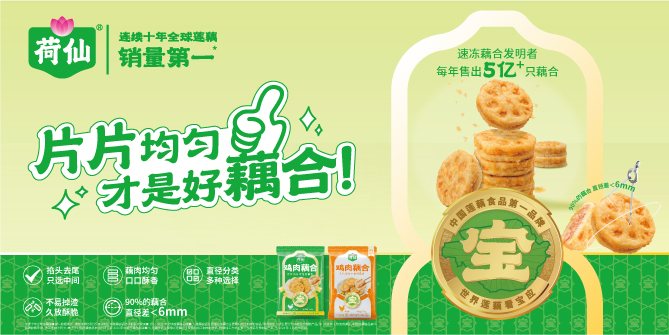 荷仙擁有中國(guó)第一條全自動(dòng)化藕合生產(chǎn)線,從采摘鮮藕到制作成藕合最快僅1.5小時(shí),荷仙的藕合真正達(dá)到了搶鮮、鎖鮮、保鮮,同時(shí)工廠嚴(yán)控藕片規(guī)格,利用大小適中的藕片制作片片均勻的藕合,形態(tài)好看,出品標(biāo)準(zhǔn)。
